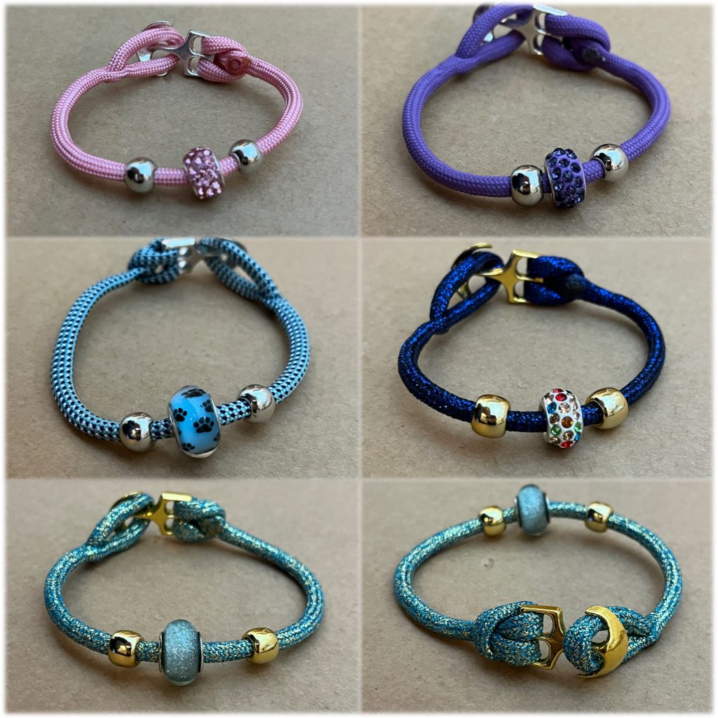 Anker sowie Bänder gibt es in verschiedenen Farben. Dazu gibt es viele Perlen / Schiebeperlen zur Auswahl. Es folgen ein paar Beispiele. Wenn Sie andere Wünsche haben, sprechen Sie mich gerne an.