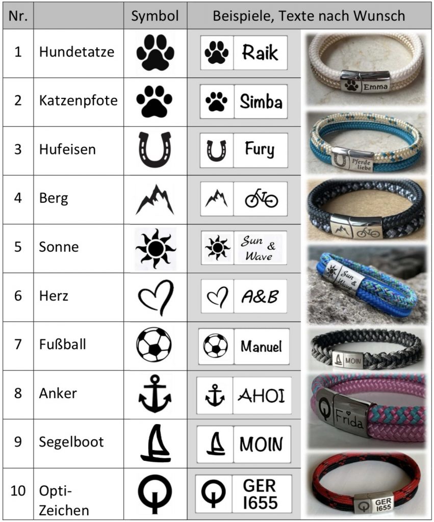 Wähle ein Symbol (Nr. 1 bis 10) aus und gib Deinen Wunschtext an, s. Beispiele. Es kann auch nur ein Symbol ohne zusätzlichen Text ausgewählt werden, das dann vorzugsweise auf den größeren Teil des Verschlusses graviert wird, s. unten bei weiteren Beispielen.