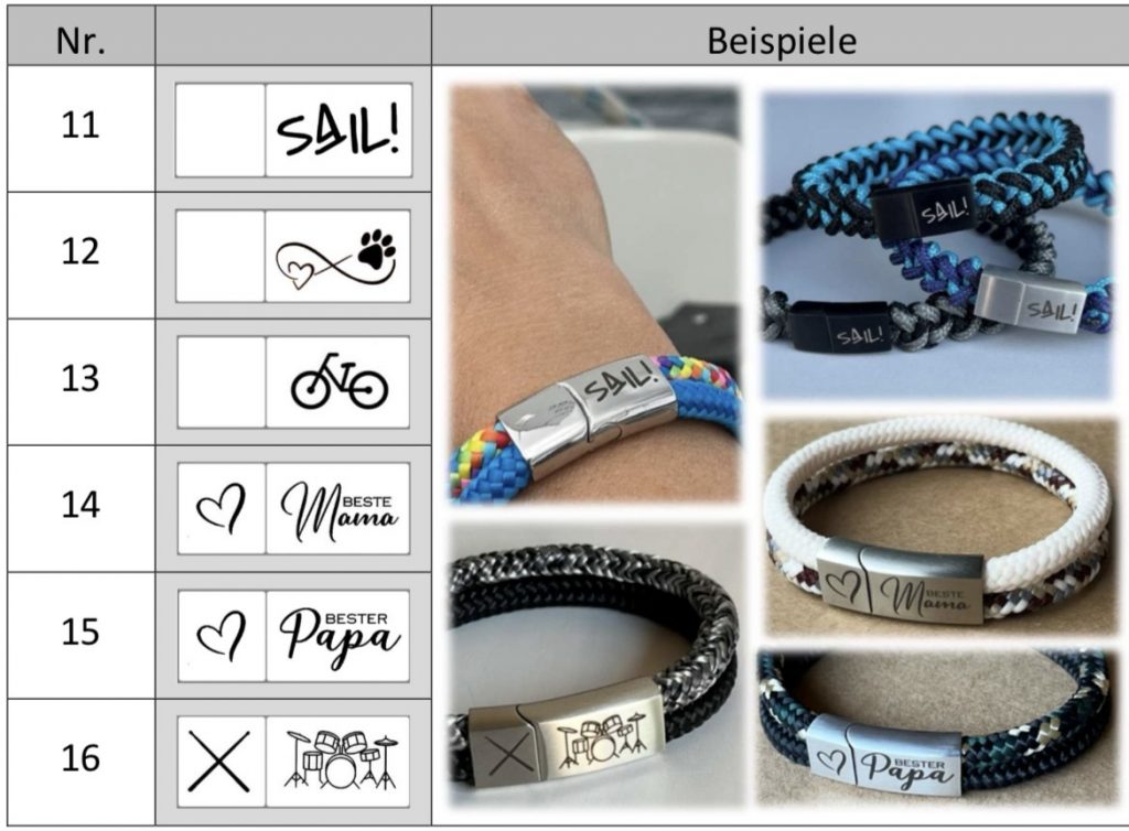 Oder wähle eine komplette Gravur von Nr. 11 bis 16 für dein Armband aus (bei Nr. 11 bis 13 könnte auch noch etwas ergänzt werden):