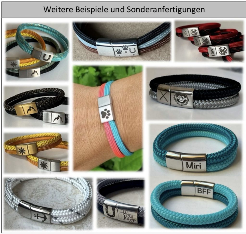 Hier kommen weitere Bildbeispiele, auch Sonderanfertigungen auf Kundenwunsch, wie z.B. zusätzliche Gravur auf der Innenseite des Armbandes. So etwas ist gegen Aufpreis nach Absprache möglich. Gerne anfragen, ich bin gespannt auf neue Ideen.