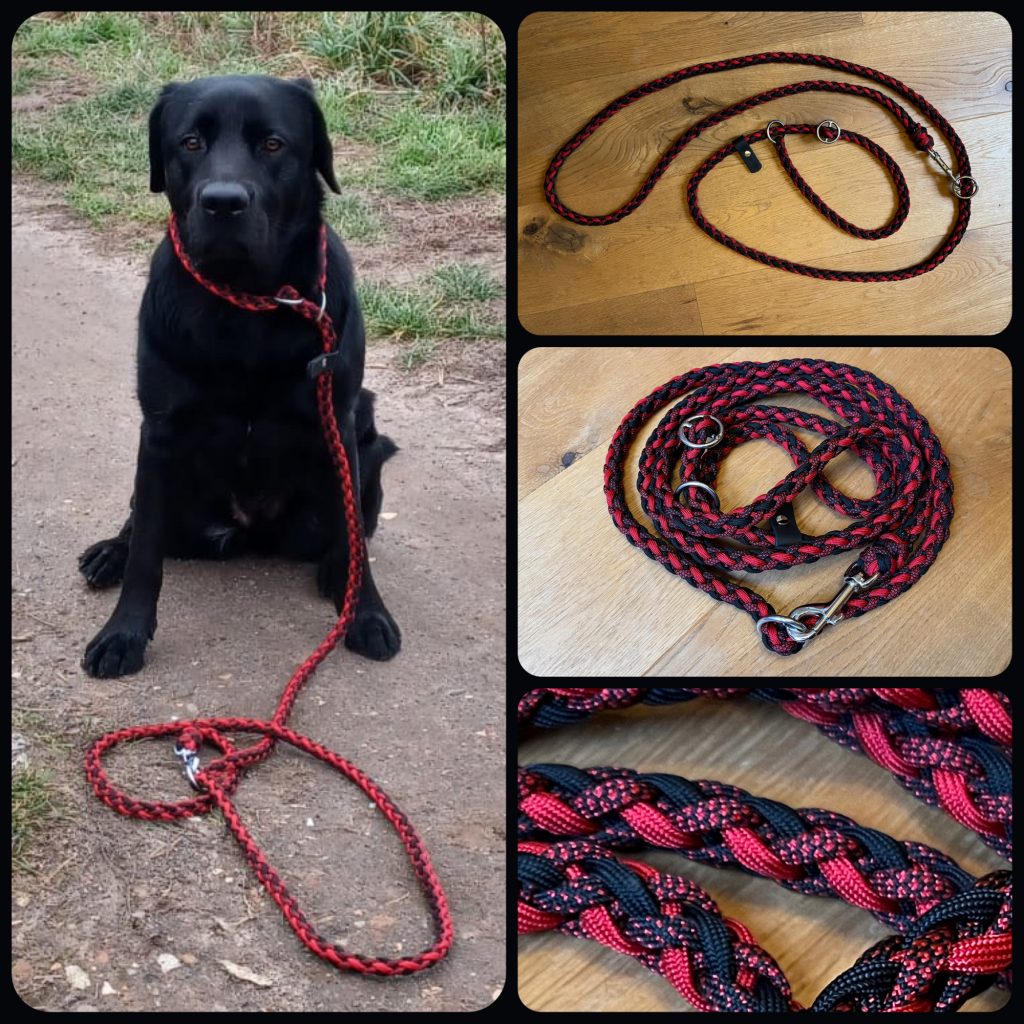 3-fach verstellbare Leine, 2m, komplett geflochten mit Muster „Herzgeflecht“ (50€)Geflochtene Leine mit Handschlaufe, ca. 1,35m, Muster „Rund“ (30€)Verstellbare 2m-Leine mit eingeknoteten Blumen, passend zum Blumenhalsband. 45€Breite Retriverleine mit HandschlaufeModell „Klara“, Retrieverleine verstellbar