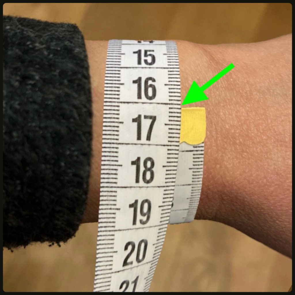 Achtung: nicht die Länge eines vorhandenen Armbandes messen – diese entspricht nicht dem Handgelenkumfang! Soll die Größe von einem vorhandenen Armband abgenommen werden, ist das nur nach Rücksprache möglich.