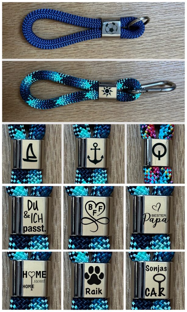 Schlüsselanhänger aus 10mm-Seil mit Schlüsselring und/oder Karabiner, und mit Gravur nach Wunsch, je 12€